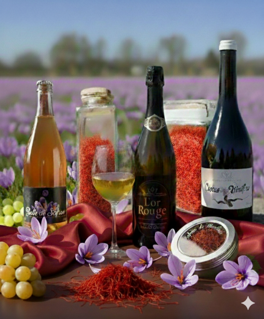 Chaque bouteille que nous élaborons est le fruit de nos récoltes, mêlant les traditions à l’innovation pour exalter la pure expression de notre terroir . Lors des vinifications le safran est un allié intéressant, il amène des notes florales et épicées typiques du safran , il y a un un équilibre exceptionnel entre ces deux produits nobles.